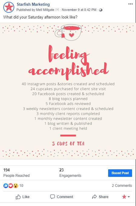The more engagement your posts get, the further your reach is and the more people get to connect with your business.